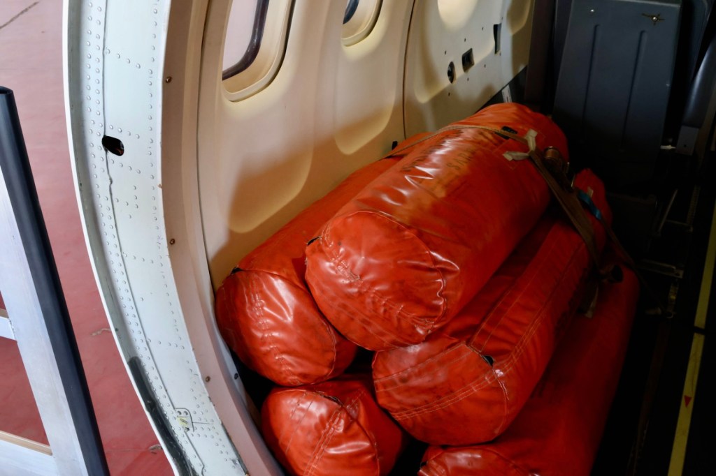 Floating devices stored in the Coast Guard’s largest aircraft are thrown into the water from 100 meters or so above the ocean.