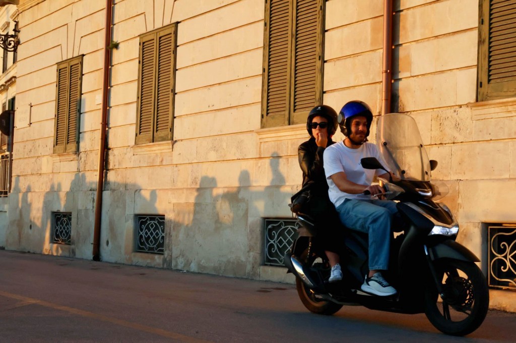 Motorcycles and Vespa scooters are common in the narrow streets of Sicily. Piazza Duomo in Siracusa, Sicily